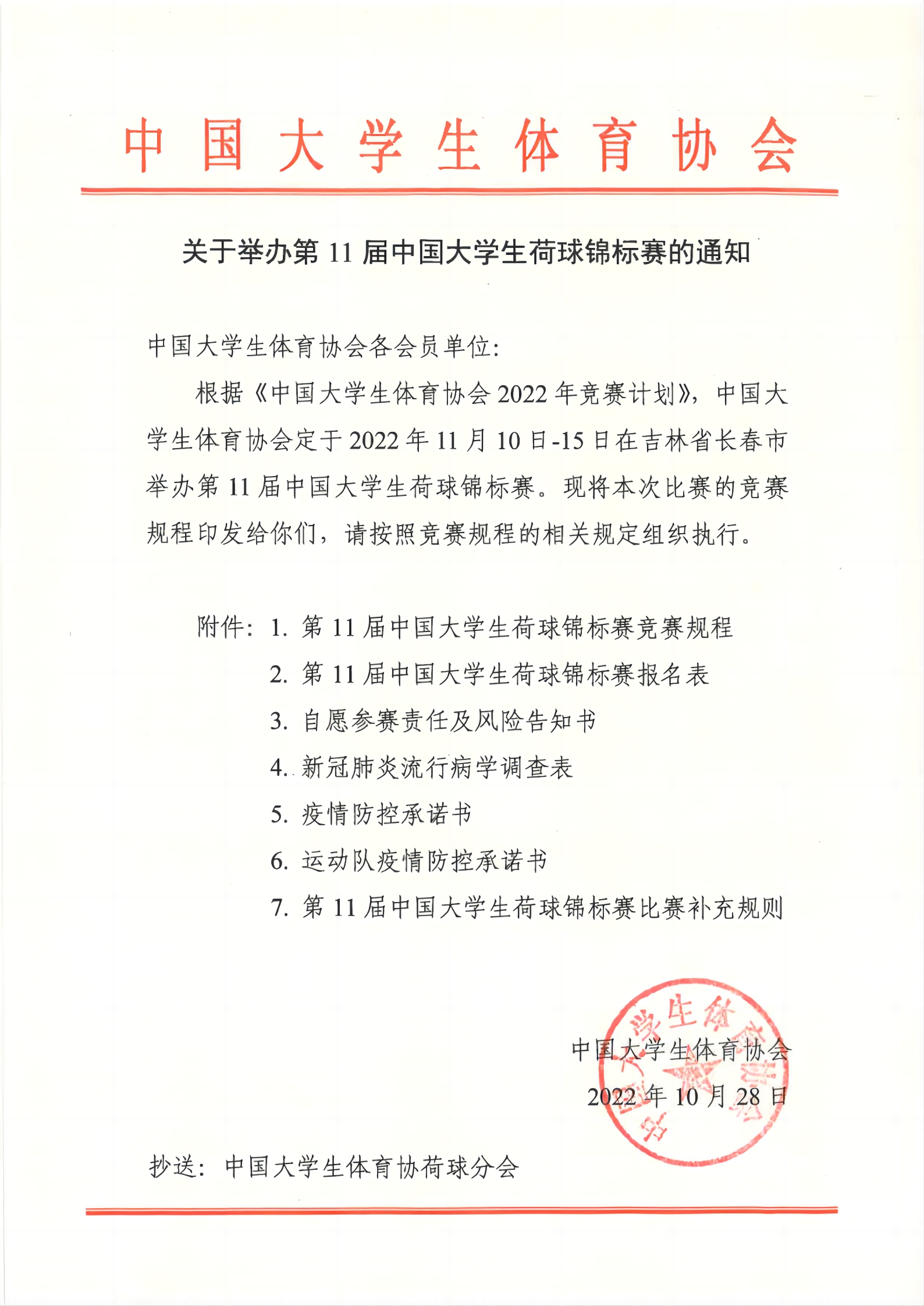 關于舉辦第11屆中國大學生荷球錦標賽的通知