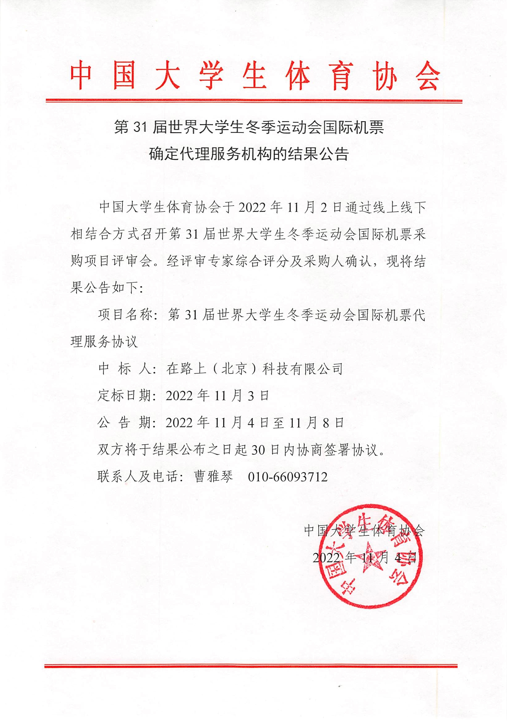 第31屆世界大學(xué)生冬季運動會國際機票確定代理服務(wù)機構(gòu)的結(jié)果公告