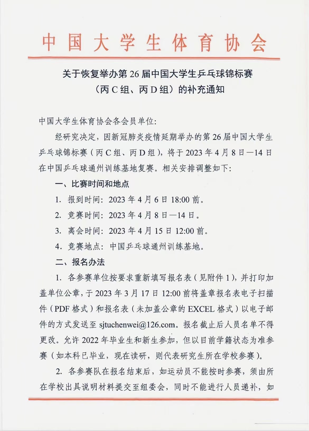 關于恢復舉辦第26屆中國大學生乒乓球錦標賽(丙C組、丙D組)的補充通知