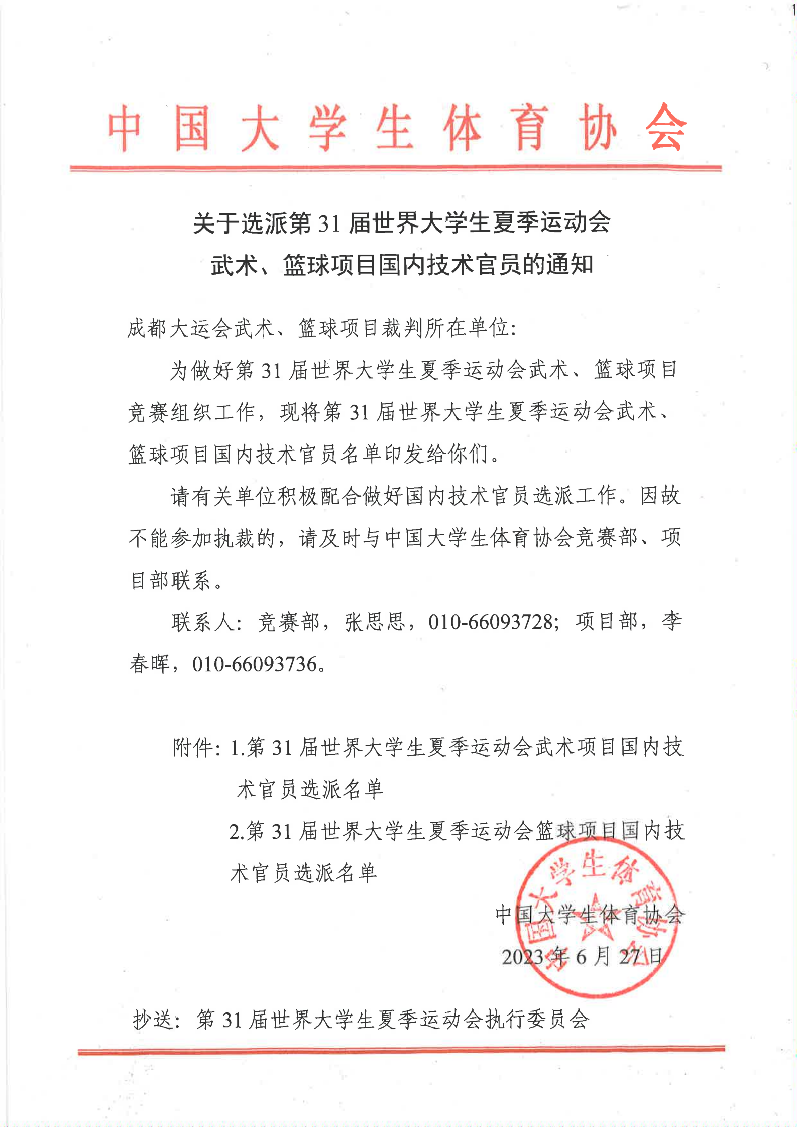 關于選派第31屆世界大學生夏季運動會武術、籃球項目國內技術官員的通知