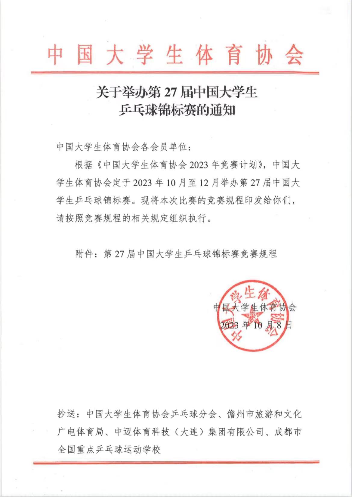 關(guān)于舉辦第27屆中國大學(xué)生乒乓球錦標賽的通知