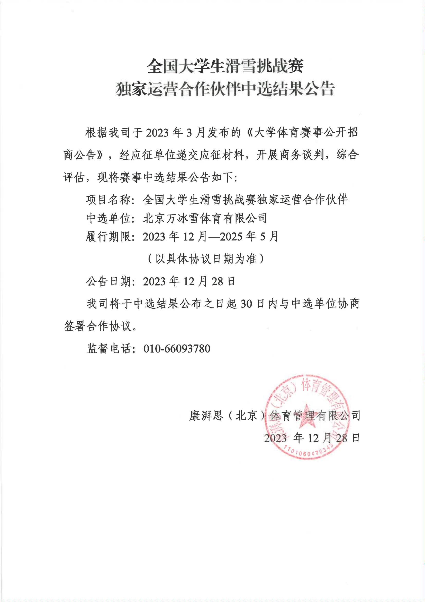 全國(guó)大學(xué)生滑雪挑戰(zhàn)賽獨(dú)家運(yùn)營(yíng)合作伙伴中選結(jié)果公告