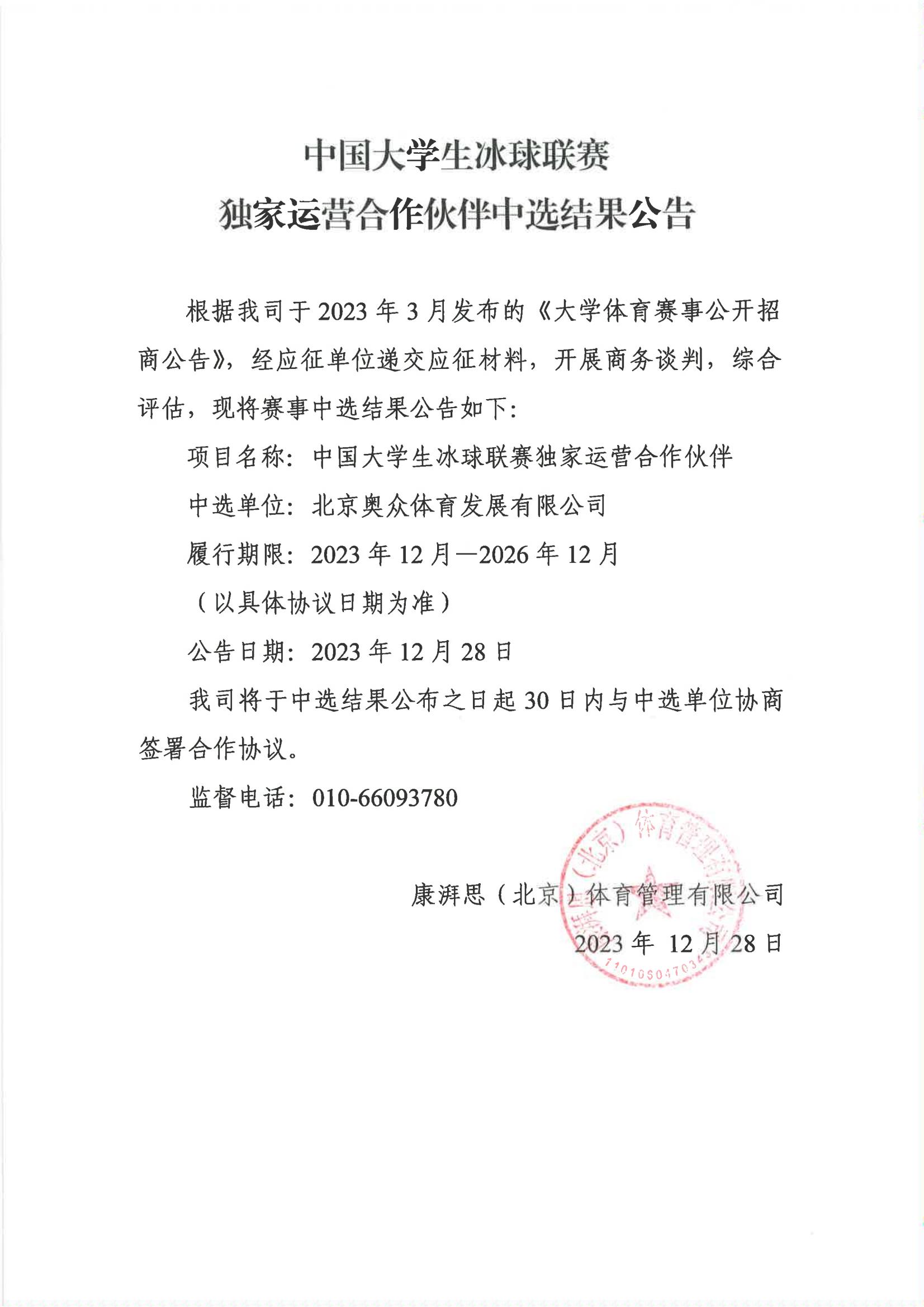 中國大學(xué)生冰球聯(lián)賽獨家運營合作伙伴中選結(jié)果公告