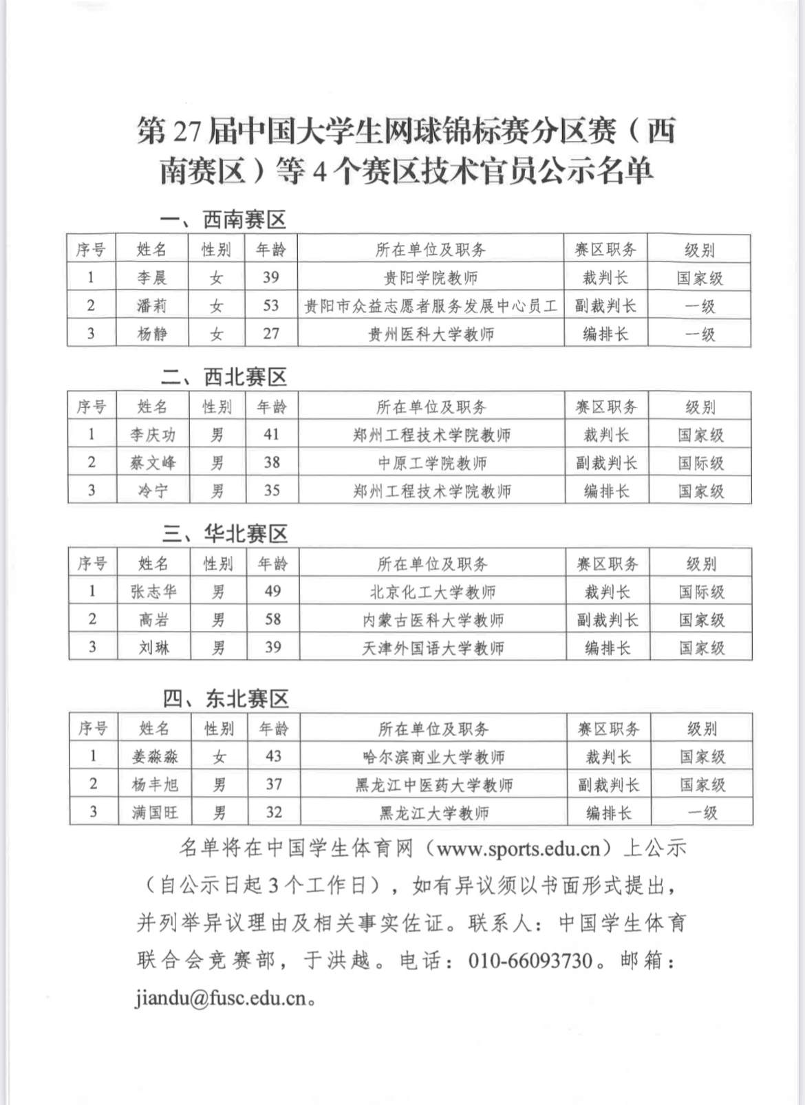 第27屆中國大學生網球錦標賽分區賽(西南賽區)等4個賽區技術官員公示