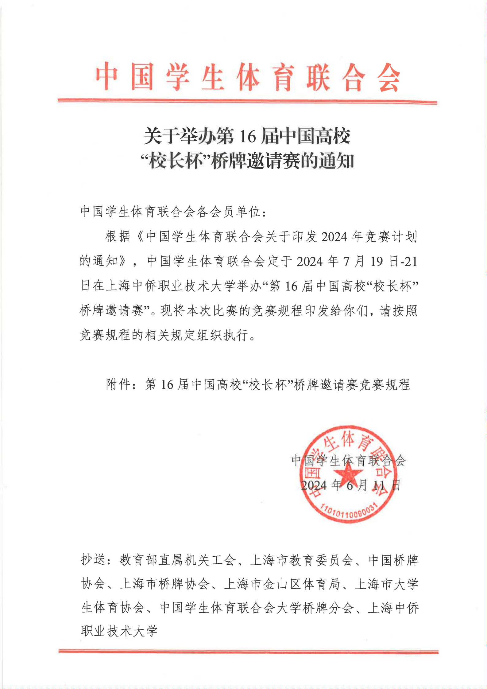 關于舉辦第16屆中國高校“校長杯”橋牌邀請賽的通知