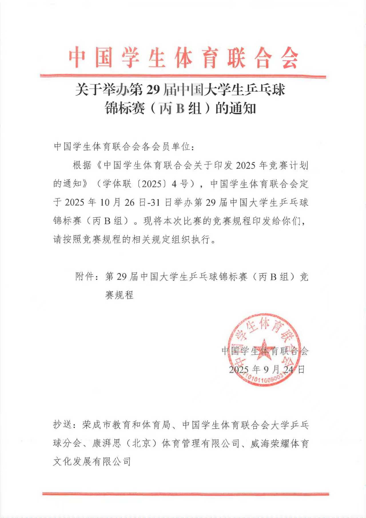 關于舉辦第29屆中國大學生乒乓球錦標賽(丙B組)的通知